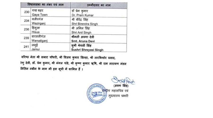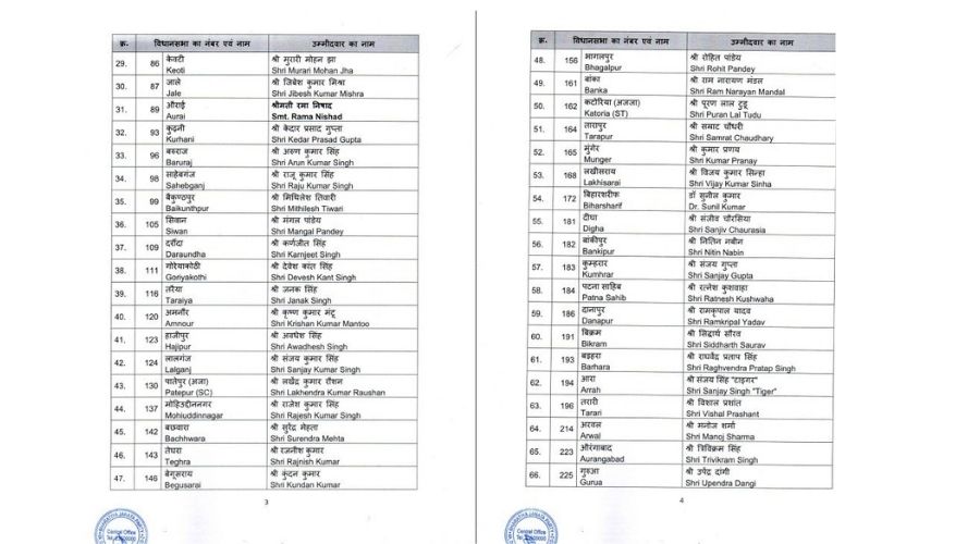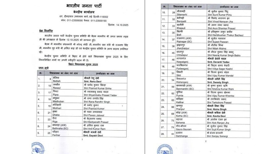 बिहार विधानसभा चुनाव के लिए भाजपा ने 71 उम्मीदवारों की पहली सूची जारी की। उपमुख्यमंत्री सम्राट चौधरी तारापुर से, उपमुख्यमंत्री विजय कुमार सिन्हा लखीसराय से, बिहार सरकार के मंत्री नितिन नबीन बांकीपुर से और रेणु देवी बेतिया से चुनाव लड़ेंगी। पार्टी ने अपनी पहली लिस्ट में 9 महिला उम्मीदवार भी घोषित किए हैं।