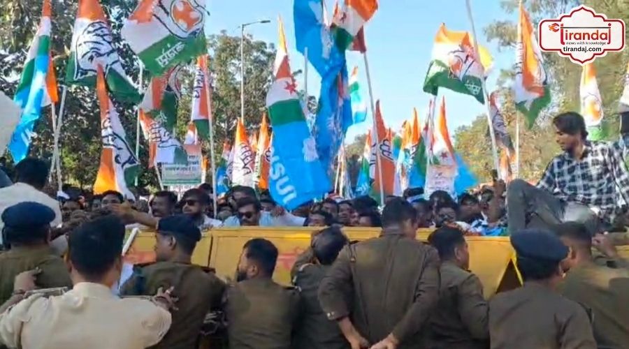 activists broke through barricades, Chhattisgarh News, Congress staged a massive protest, Manendragarh DFO, Manendragarh News, protest against the Manendragarh DFO, tirandaj.com, tirandaj.com top 10 news web site, कांग्रेसी कार्यकर्ताओं, जिला कांग्रेस कमेटी, मनेन्द्रगढ़ जिला मुख्यालय, वन मंडल के डीएफओ