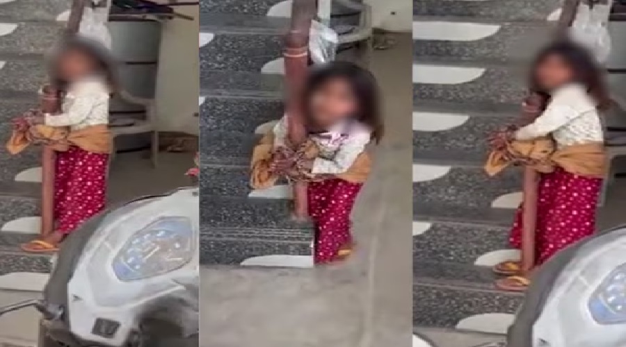 Man Beat Girl ऊना (हिमाचल प्रदेश): इंसानियत को शर्मसार कर देने वाली घटना सामने आई है। यहां बहडाला गांव में एक रिटायर्ड फौजी ने मात्र एक अमरूद तोड़ने के शक में 6 साल की मासूम बच्ची को जंजीर और रस्सी से सीढ़ियों की रेलिंग से बांध दिया।