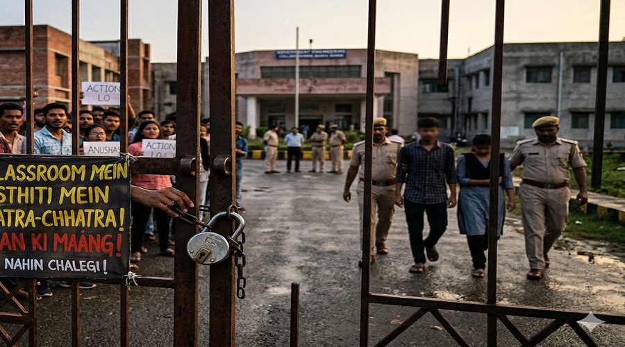 Student Couple Romance कुछ छात्रों द्वारा इस दृश्य को देख लेने के बाद घटना की खबर आग की तरह फैल गई। छात्रों में भारी रोष फैल गया और उन्होंने इसे शैक्षणिक संस्थान के अनुशासन और संस्कृति पर हमला बताते हुए जोरदार विरोध प्रदर्शन शुरू कर दिया। नारेबाजी के दौरान एक छात्र ने कॉलेज के मुख्य गेट पर ताला जड़ दिया, जिससे परिसर में तनावपूर्ण माहौल बन गया।